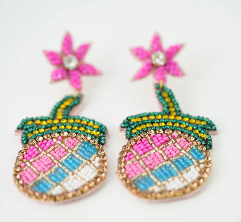 Bring tropical vibes to your look with our playful Pineapple Shape Pink Drop Earrings. Handcrafted with intricate beadwork, these earrings feature a fun pineapple silhouette paired with vibrant pink tones, making them a perfect blend of quirky and chic.